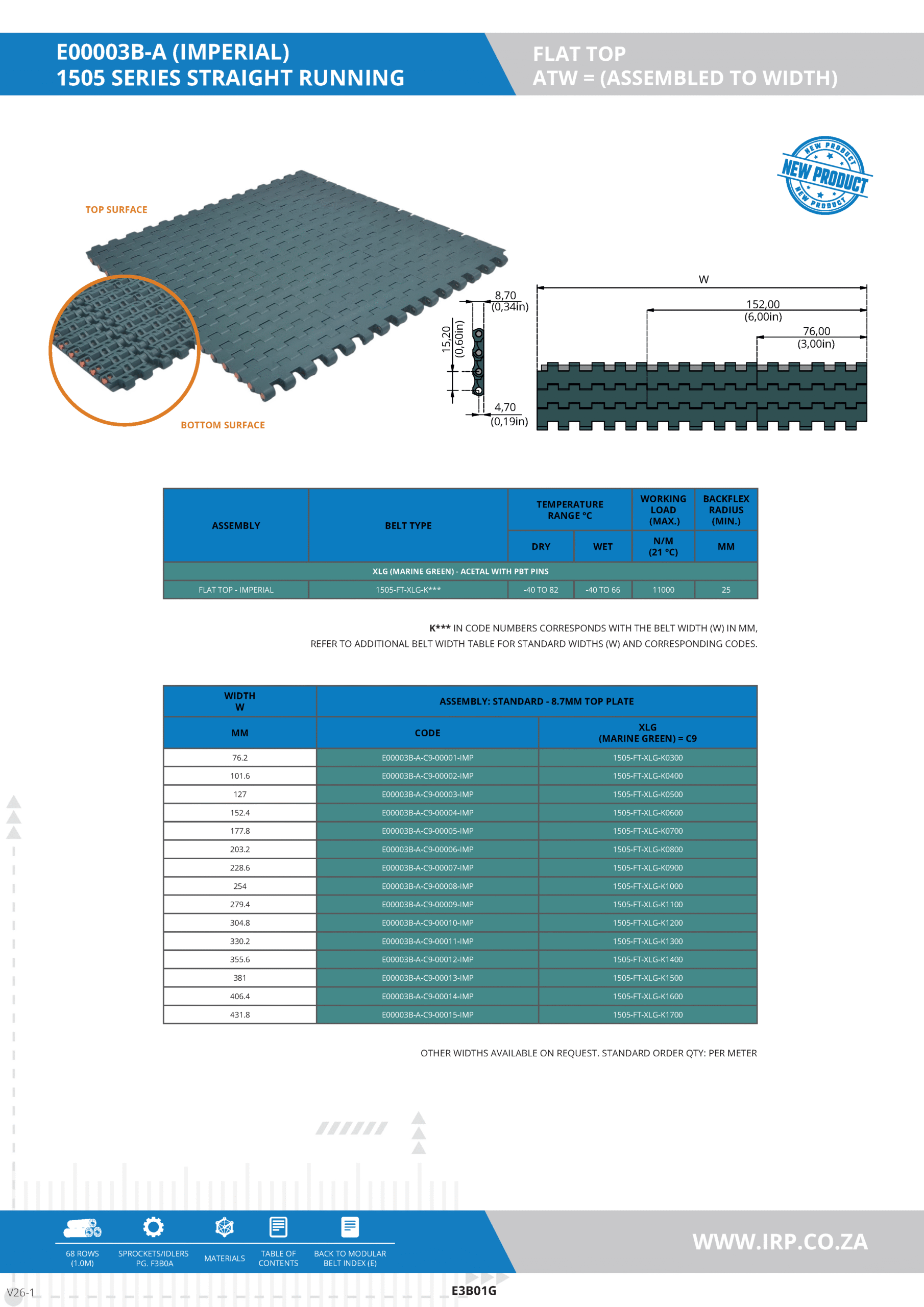 The 1505 Series Imperial Flat Top modular belt is designed for high-strength applications requiring a flat, continuous surface. It features an 8.7 mm thick top plate and is assembled with acetal-based material and PBT pins for enhanced wear resistance and durability. Its flat top provides maximum product support, making it ideal for conveying packaged goods or containers.