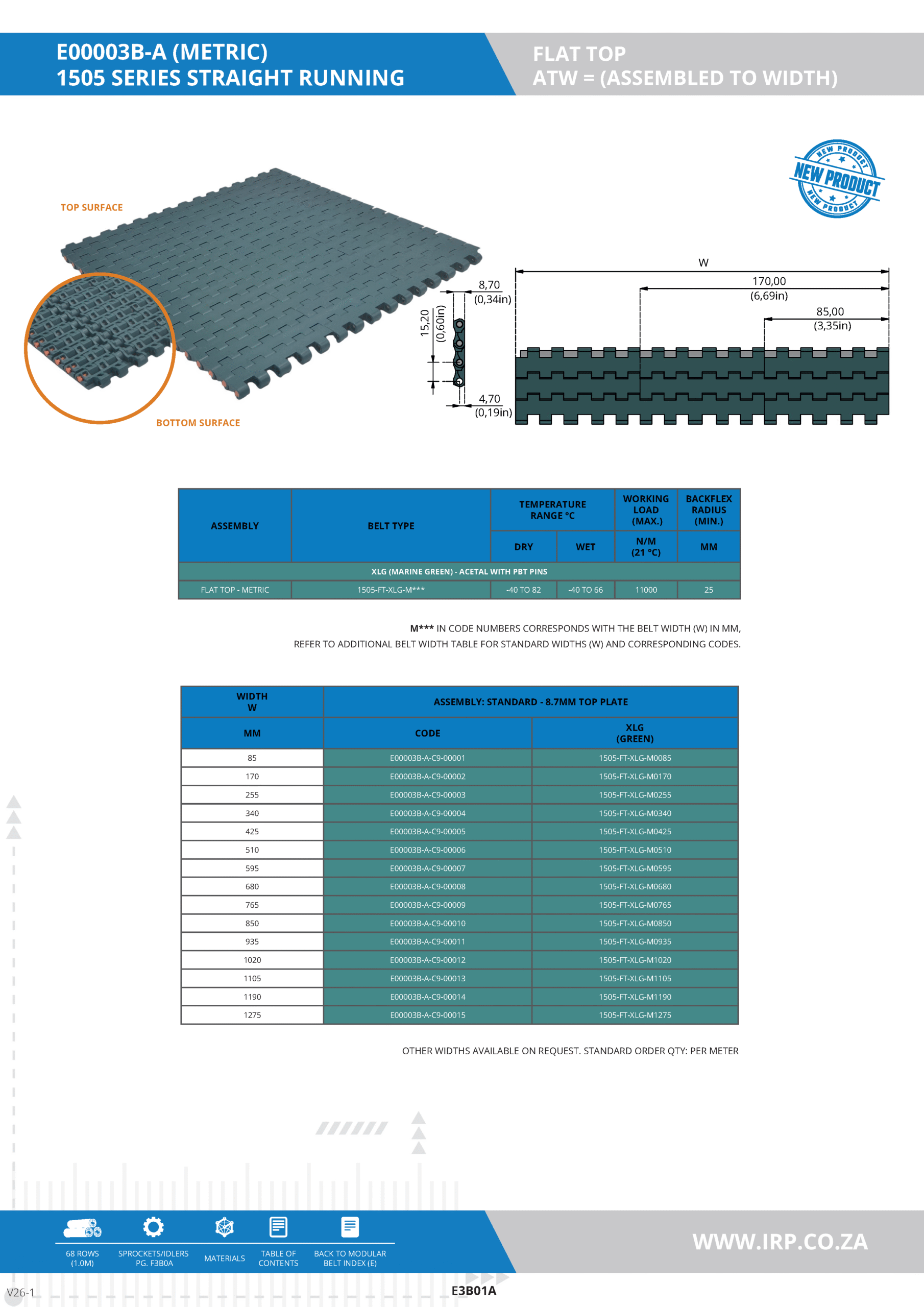 The 1505 Series Metric Flat Top modular belt is designed for high-strength applications requiring a flat, continuous surface. It features an 8.7 mm thick top plate and is assembled with acetal-based material and PBT pins for enhanced wear resistance and durability. Its flat top provides maximum product support, making it ideal for conveying packaged goods or containers.