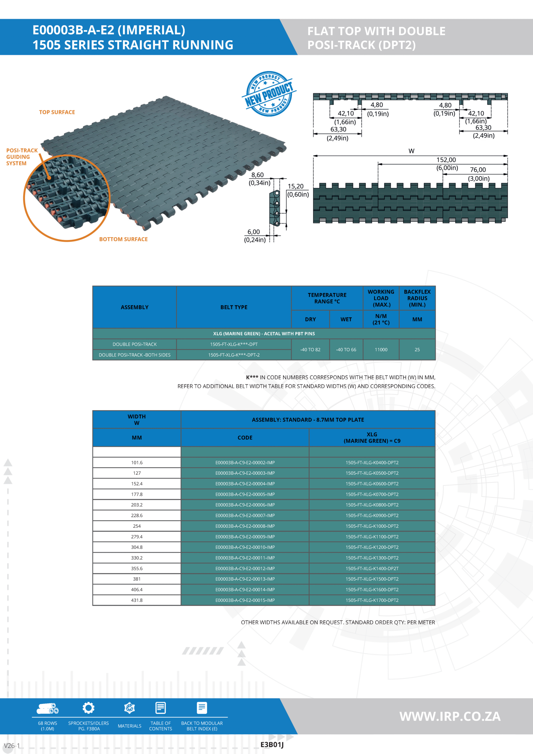 The 1505 Series Flat Top Belt with Posi-Track on both sides of the belt (DPT2) is designed for demanding straight-running applications requiring ultimate stability. With Posi-Track guiding on both sides, this belt prevents lateral drift and ensures precise alignment even under heavy loads. Manufactured from durable Low Friction Acetal and PBT pins, it’s built to perform across wide temperature ranges and is pre-assembled to width for easy installation.