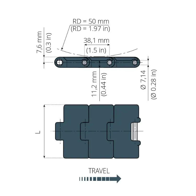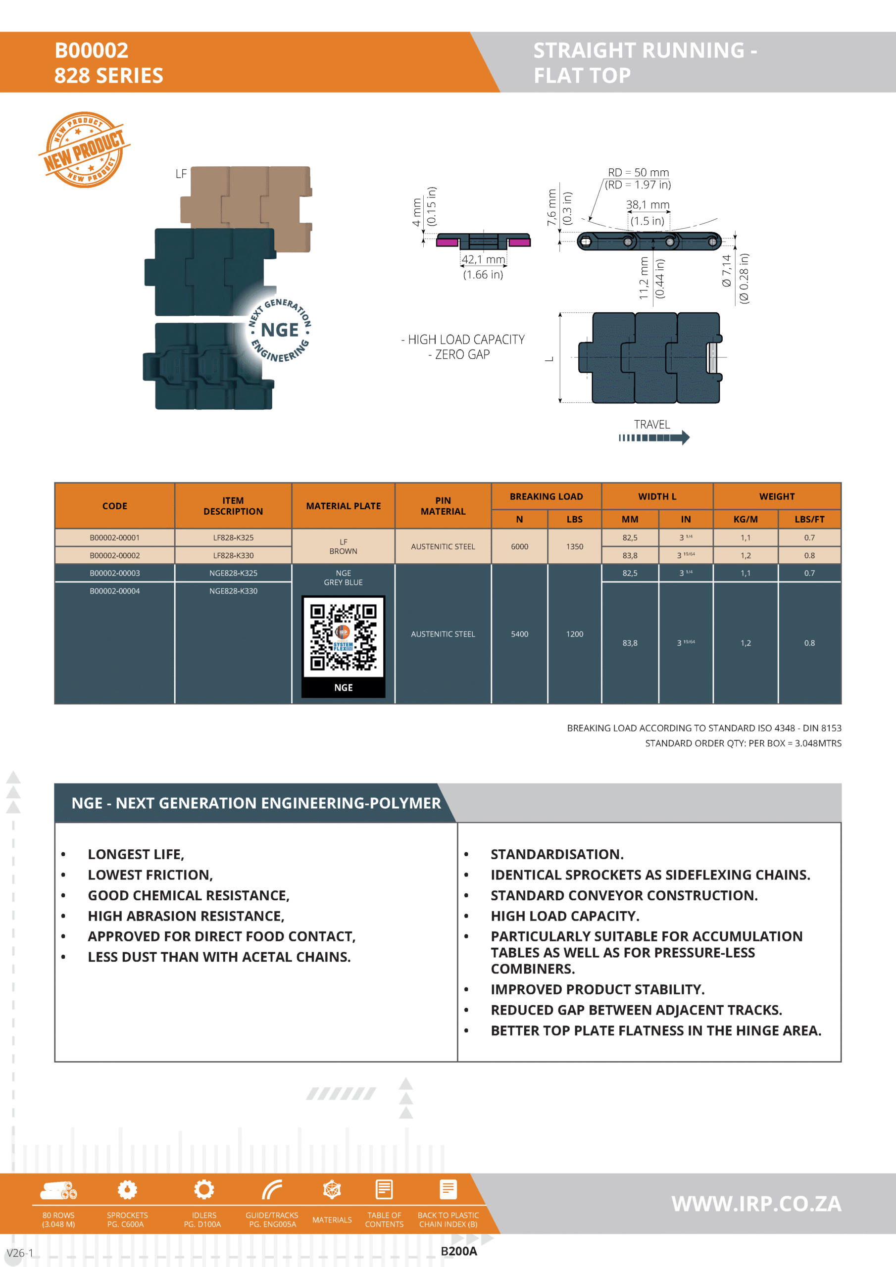 Crafted from Next Generation Engineering Polymer (NGE) and austenitic stainless steel, this chain is built for enhanced durability, chemical resistance, and low abrasion, making it suitable for extensive use in food processing and packaging industries.