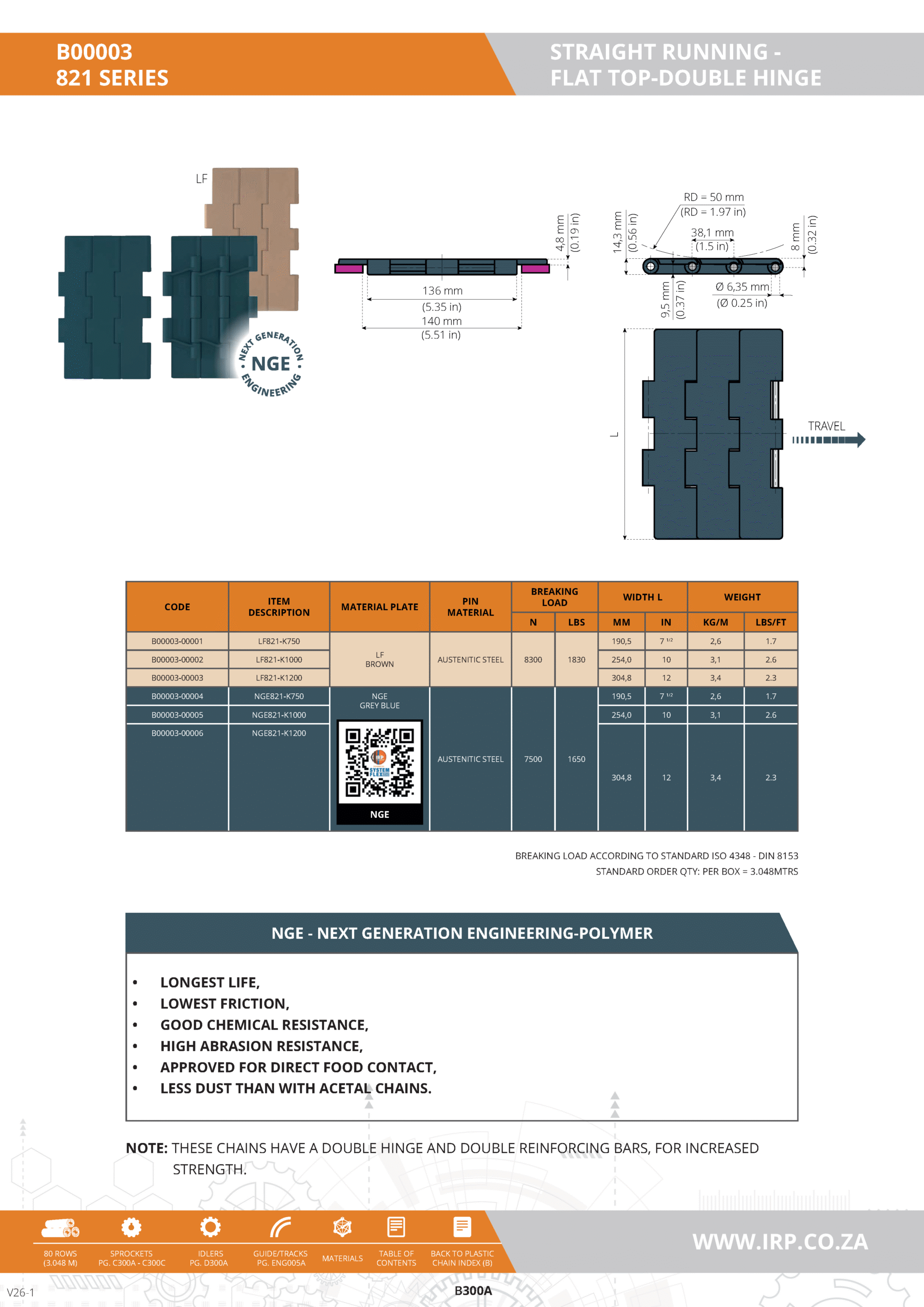 Constructed from Next Generation Engineering Polymer (NGE) with austenitic stainless steel pins, this chain is designed for enhanced durability and chemical resistance, ideal for harsh industrial environments.