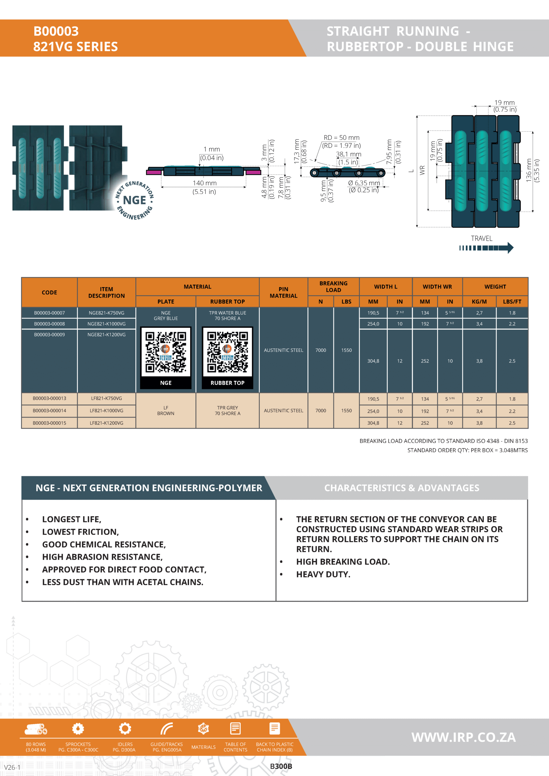 Constructed using Next Generation Engineering Polymer (NGE) for the base, with Thermoplastic Rubber (TPR) for the friction top, and reinforced with austenitic stainless steel pins, this chain offers superior durability and chemical resistance.