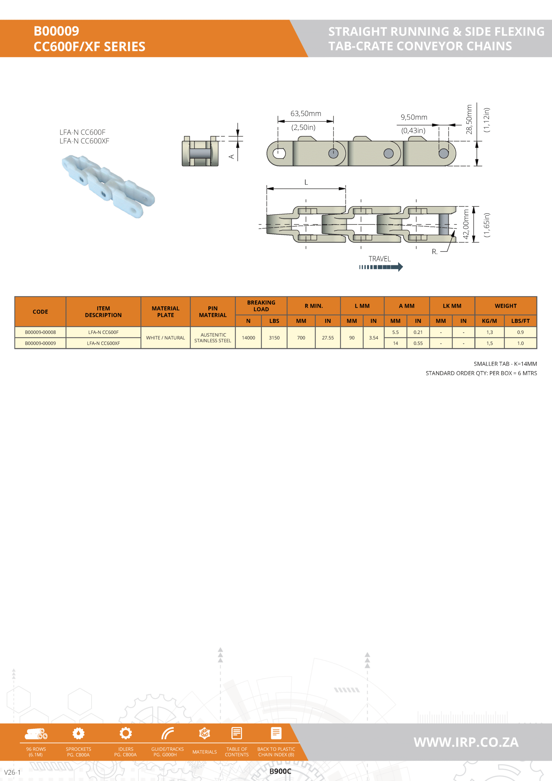 These chains are specially crafted to facilitate smooth transitions and efficient handling in tab-crate applications. Featuring a robust design and enhanced flexibility, the CC600F and CC600XF series are ideal for applications requiring both straight running and side flexing capabilities.