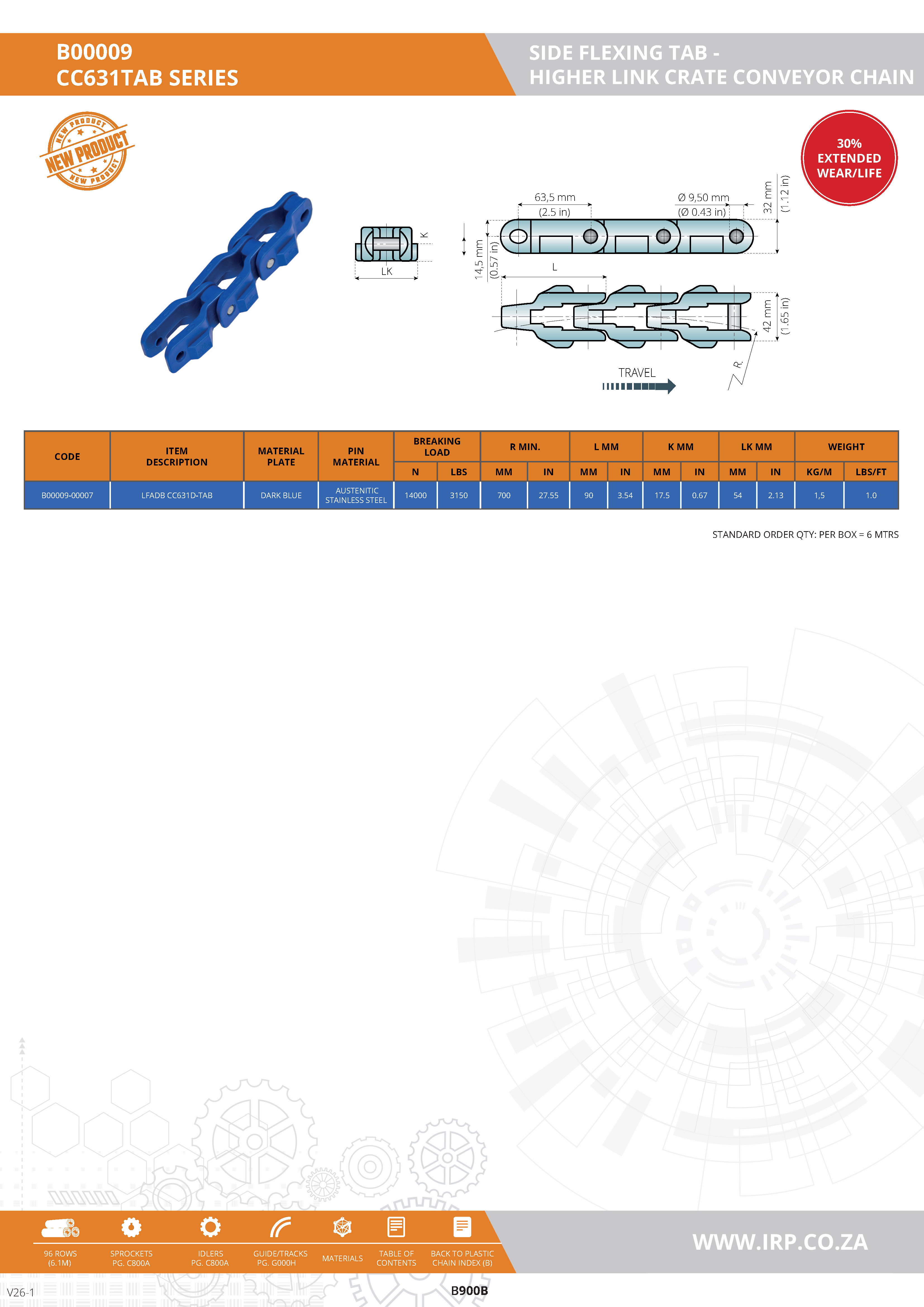 LFADB Polymer (Dark Blue): A low-friction, abrasion-resistant polymer engineered for crate conveyor environments, providing smooth chain articulation and extended service life.