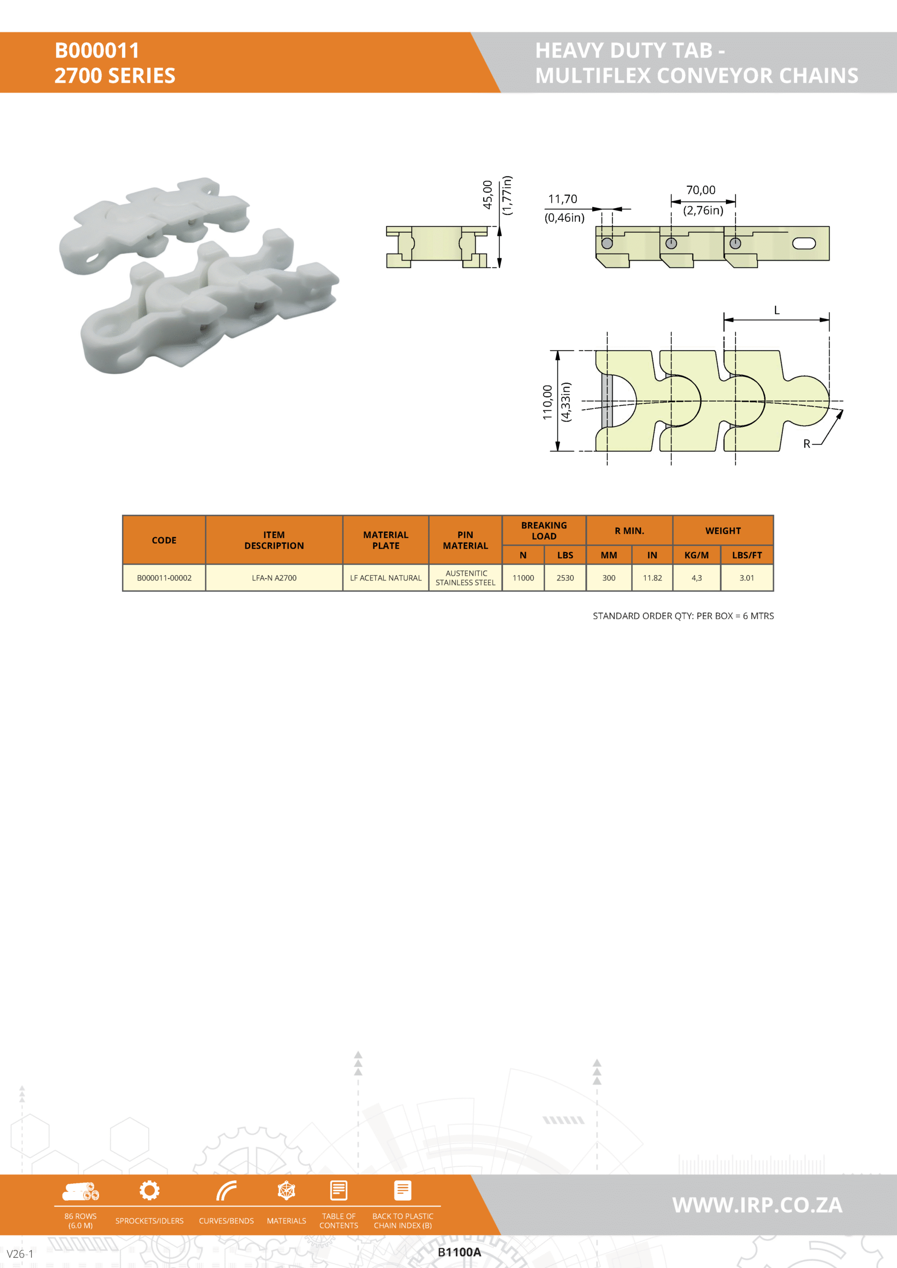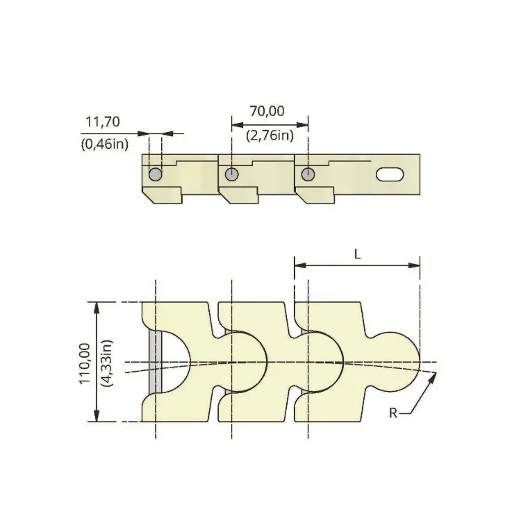 The chain plates are made from LF Acetal Natural material, known for its low friction and high durability. Combined with austenitic stainless steel pins, these chains are corrosion-resistant and built to withstand harsh industrial environments while ensuring long service life.