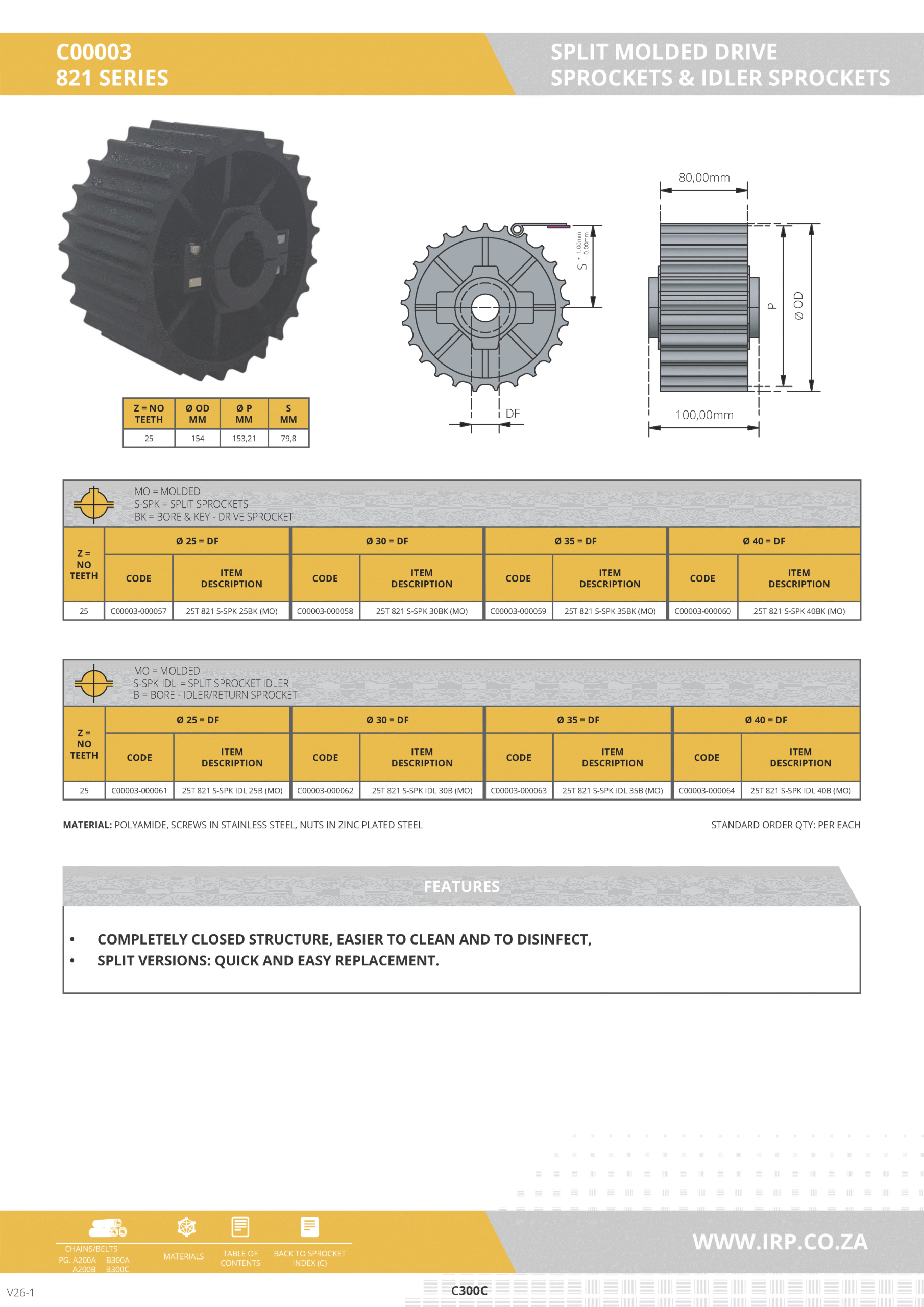 C00003 821 Series Split Molded Drive Sprockets & Idler Sprockets