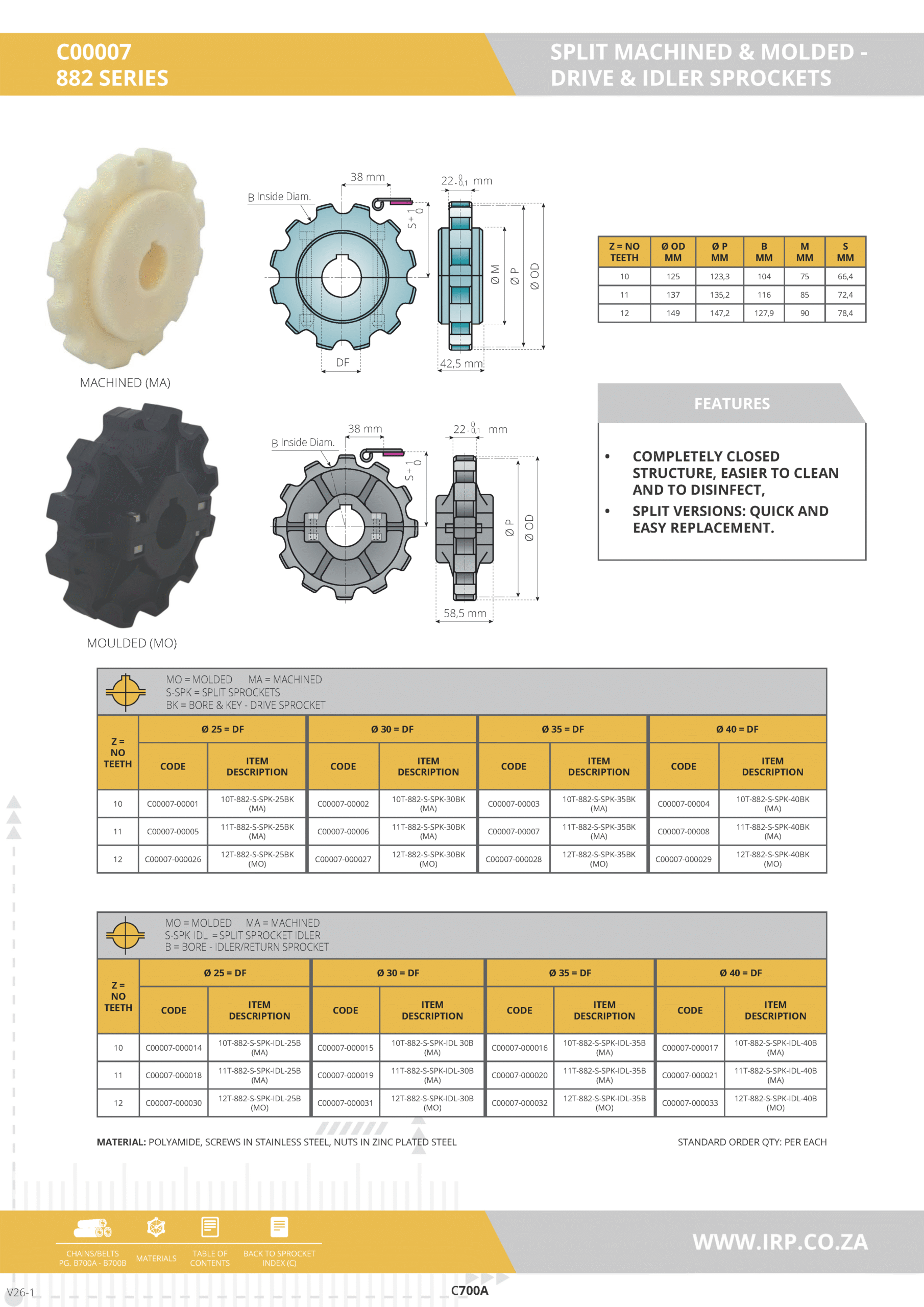 The 882 Series combines the precision of machined components with the adaptability of molded sprockets, designed for high-demand environments where durability and flexibility are paramount. These sprockets feature a split design, allowing for quick replacements and easy maintenance, significantly reducing downtime. Constructed from high-grade polyamide and equipped with stainless steel screws and zinc-plated steel nuts, these sprockets are built to withstand rigorous industrial use while maintaining cleanliness and hygiene.