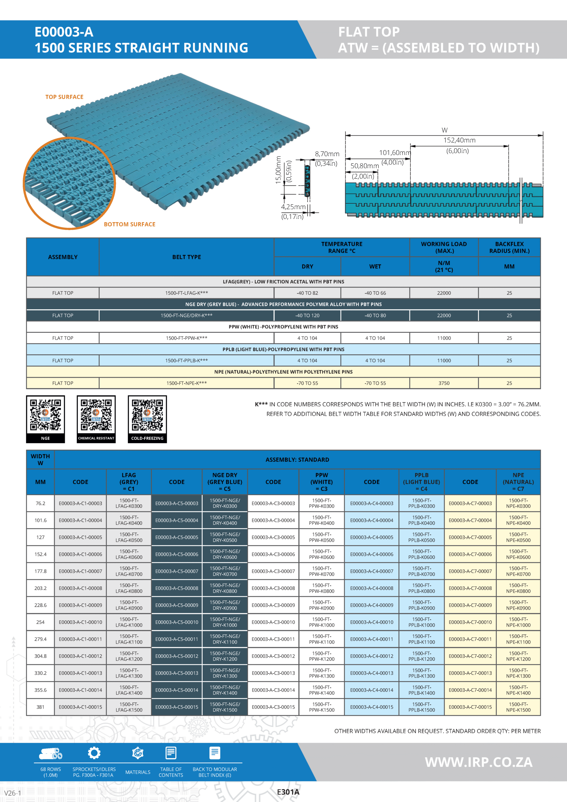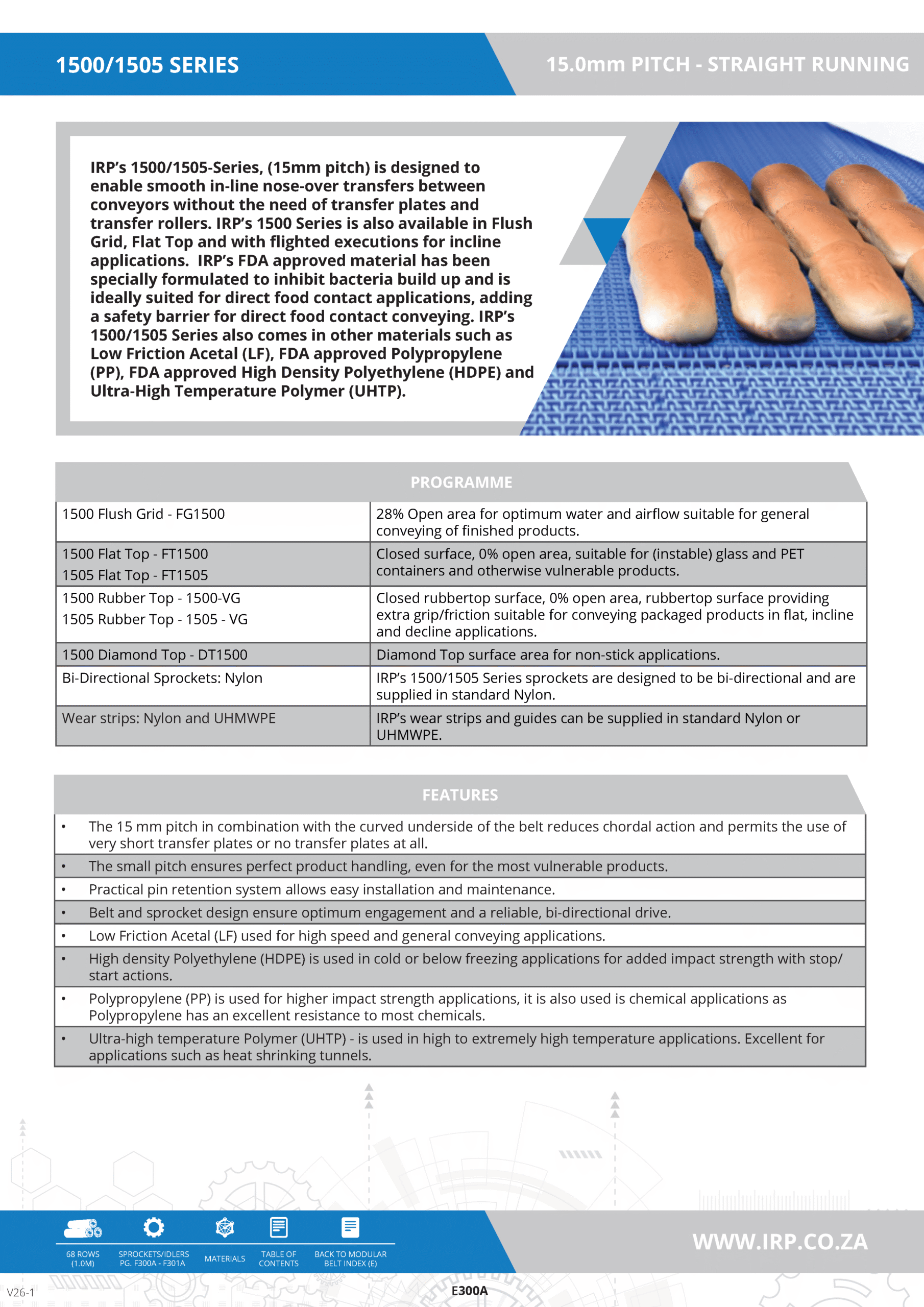 The 1500 Series offers flat top belts tailored for straight running applications, featuring a variety of materials including low friction acetal, advanced performance polymer, and polypropylene. These belts are designed for high strength and optimal performance in various industrial settings, from food processing to pharmaceutical manufacturing.