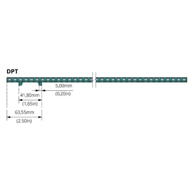 The 1000 Series Flat Top Straight Running Modular Belt with Posi-Track (DPT) is designed for superior performance in various industrial applications, offering excellent durability and resistance to wear. It is ideal for systems requiring a reliable, dry-running solution.