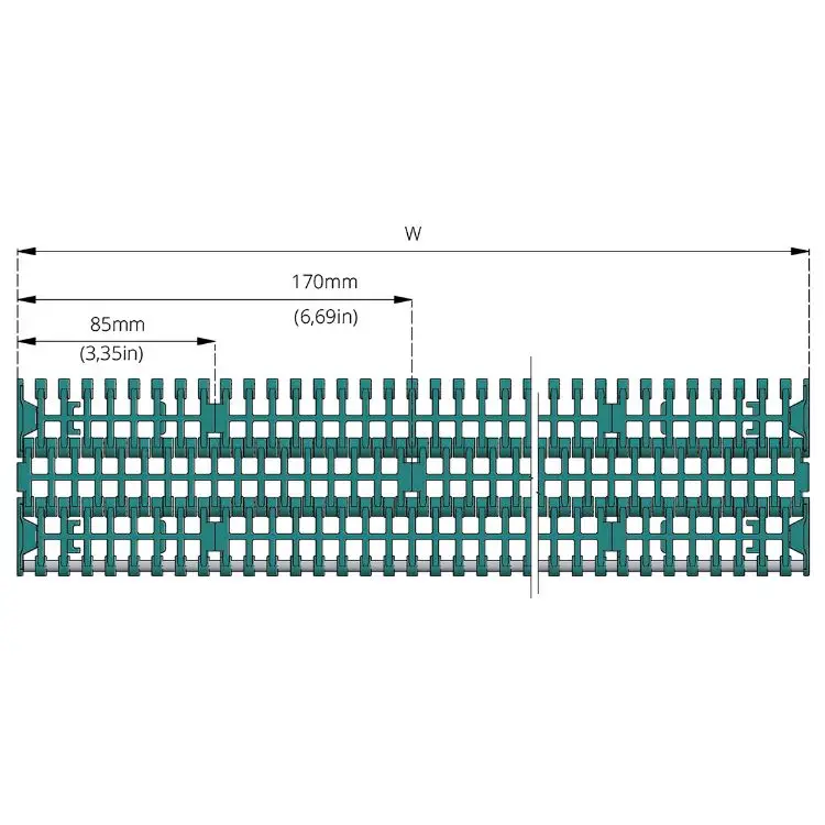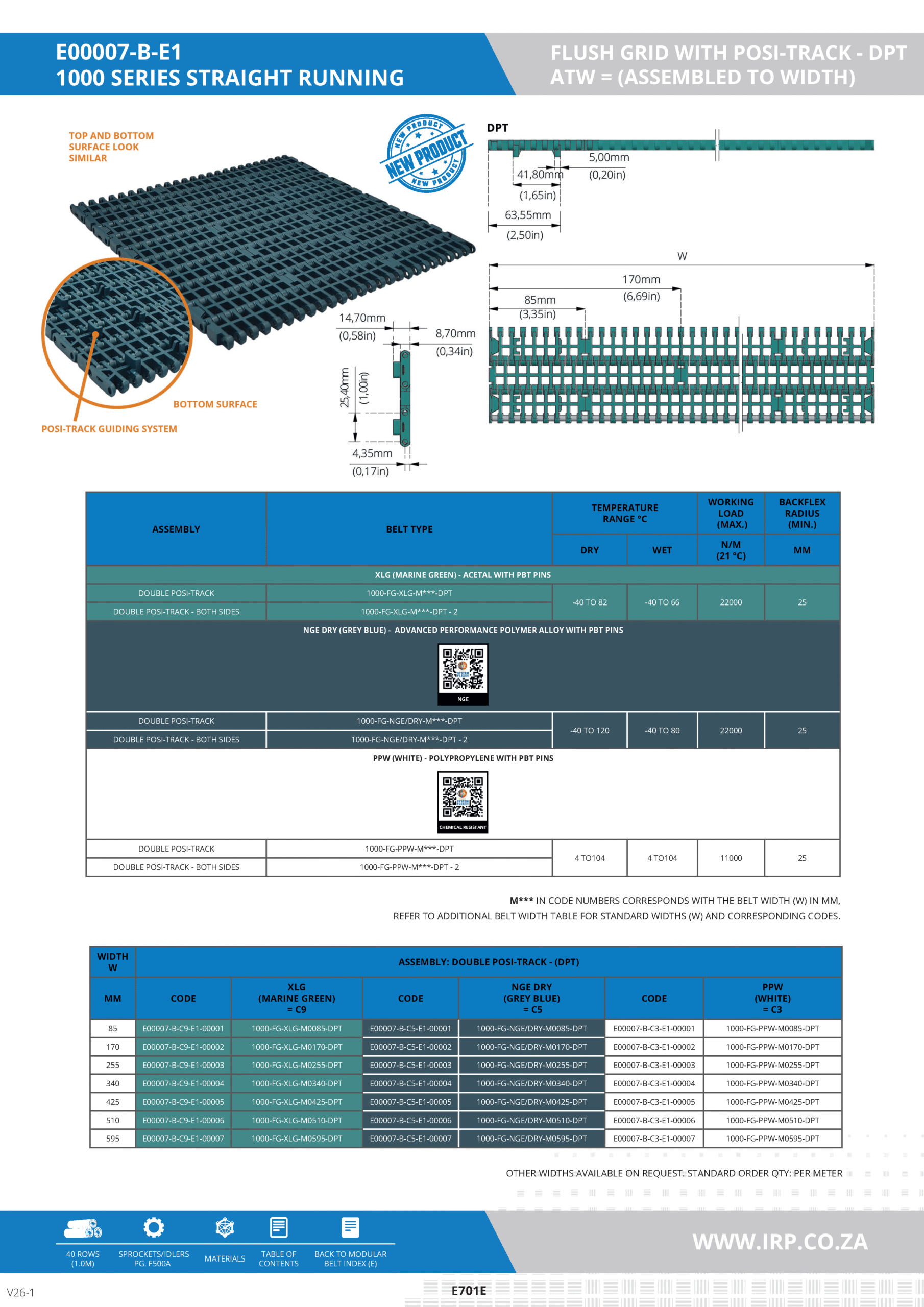 The 1000 Series Flush Grid Straight Running Modular Belt with Posi-Track (DPT) is an advanced belt solution, ideal for industrial applications that demand superior airflow and drainage. Made from high-quality Acetal and featuring PBT pins, this belt ensures durability, low maintenance, and consistent performance. The Posi-Track design further enhances stability and reliability, making it a preferred choice for industries requiring precise product handling.