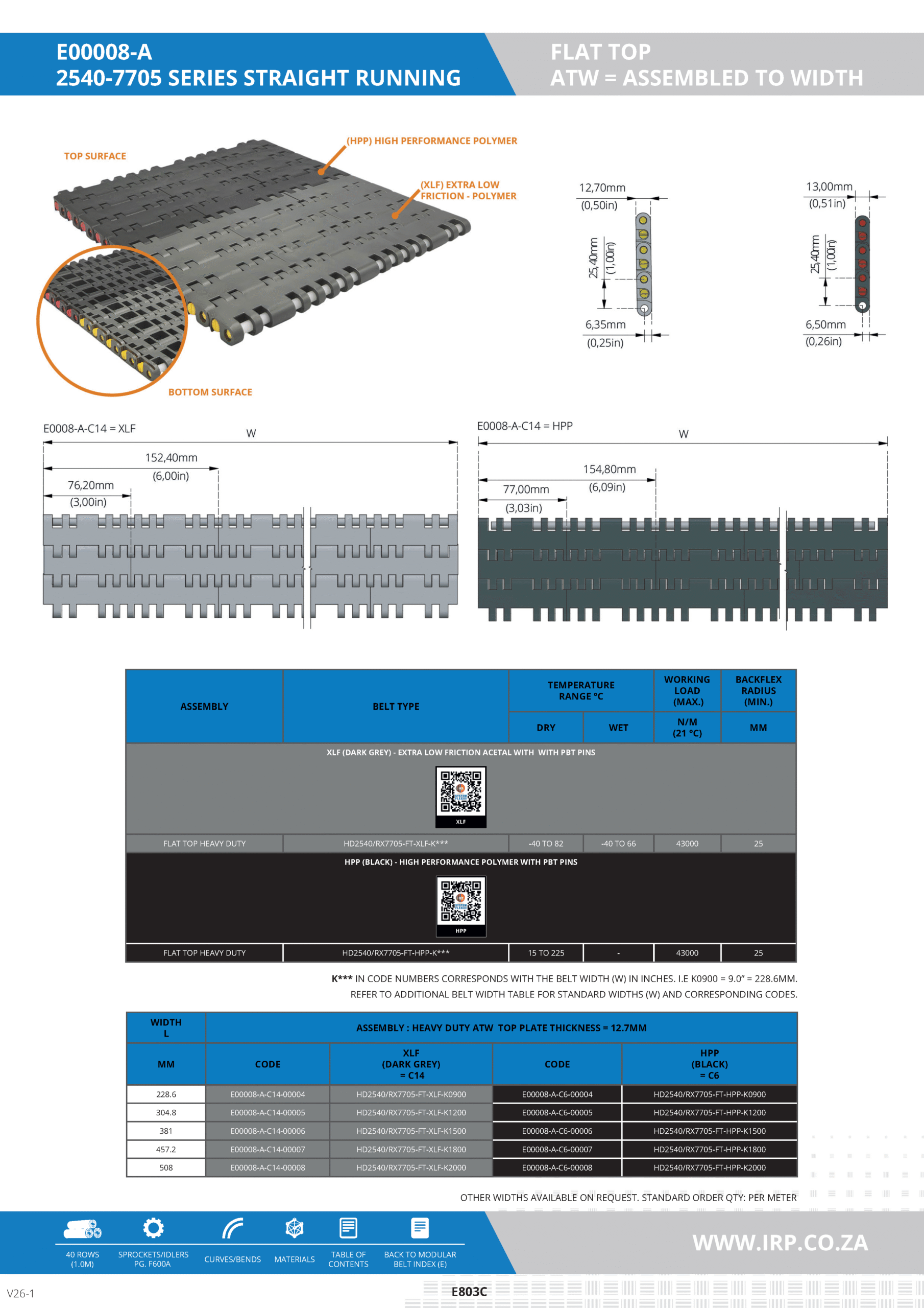 The 2540 Flat Top heavy-duty modular conveyor belt, part of the 2540-7705 Series. With 12.7 mm thick top plates and reinforced construction, it offers reliable performance in high-load industrial applications. Available in two material options—XLF (extra low friction acetal) and HPP (high performance polymer)—this belt is ideal for wet or dry environments where strength and reliability are critical.