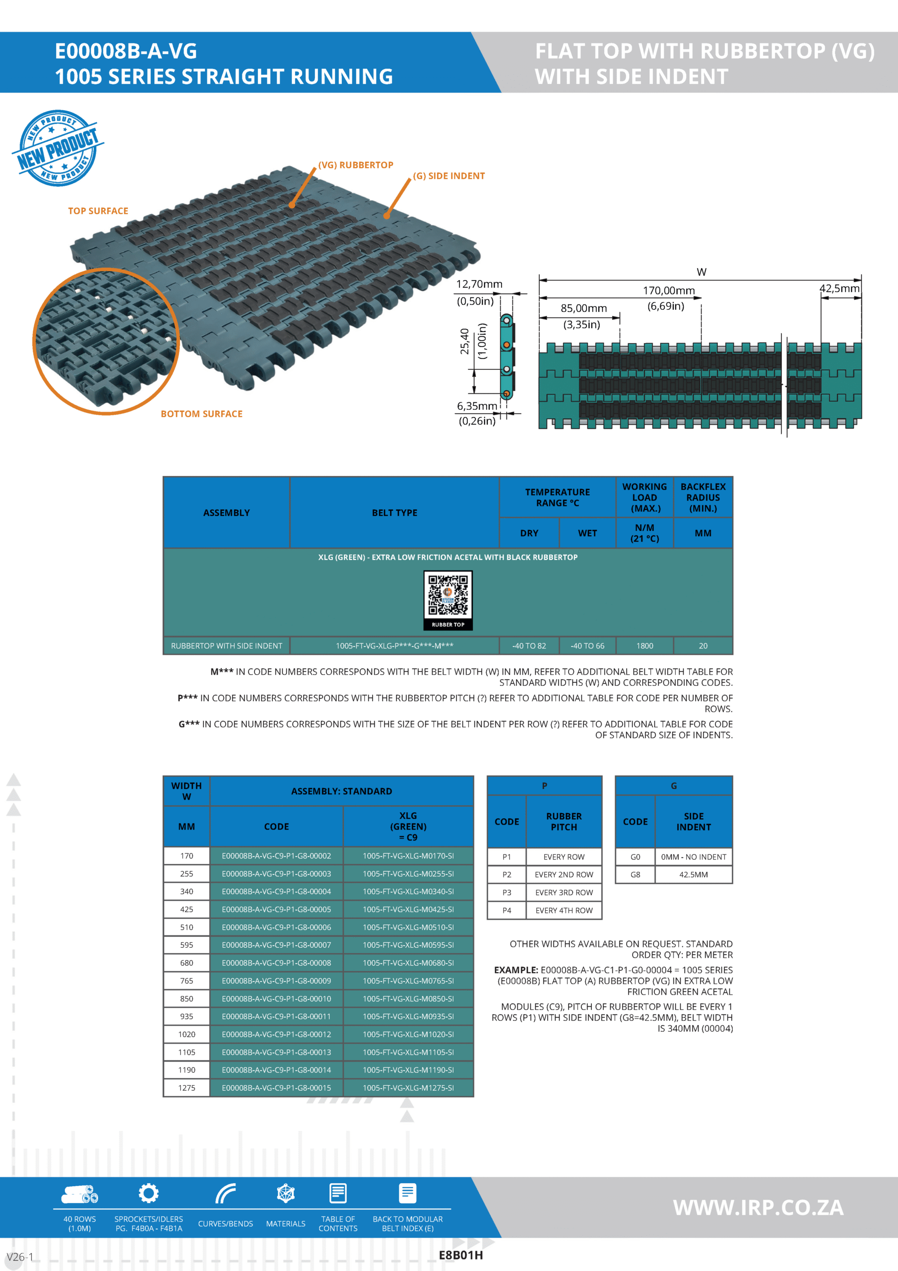 This1005 Series is a high-performance modular conveyor belt featuring a flat top surface, RubberTop (VG) inserts for increased grip, and a 42.5 mm side indent to support product guidance and containment. Built using XLG extra-low-friction acetal and available in various widths and rubber insert pitches, this belt is ideal for straight-running conveyors transporting goods on inclines, declines, or in wet/slippery conditions. Its robust design and material composition deliver reliability, reduced maintenance, and excellent product control.