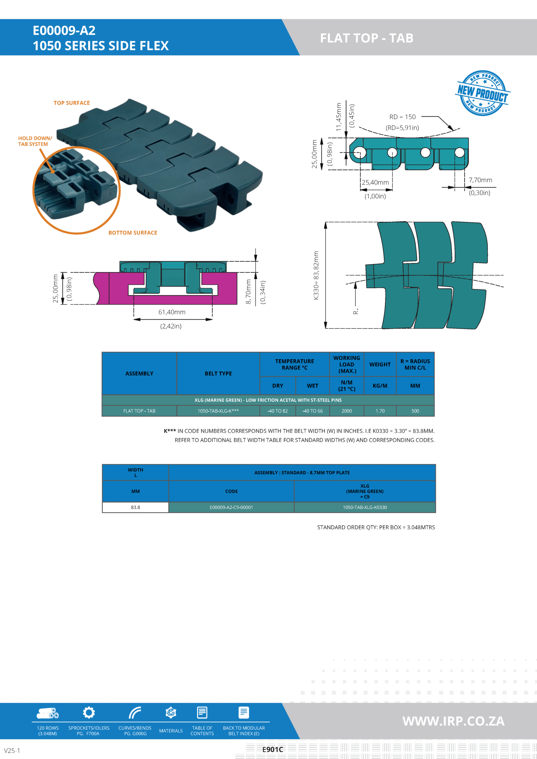 XLG (Marine Green) is a high-performance acetal polymer offering low friction and excellent wear resistance. Reinforced with 1T stainless steel pins, the belt ensures dimensional stability and durability even in high-speed or chemically exposed applications.
