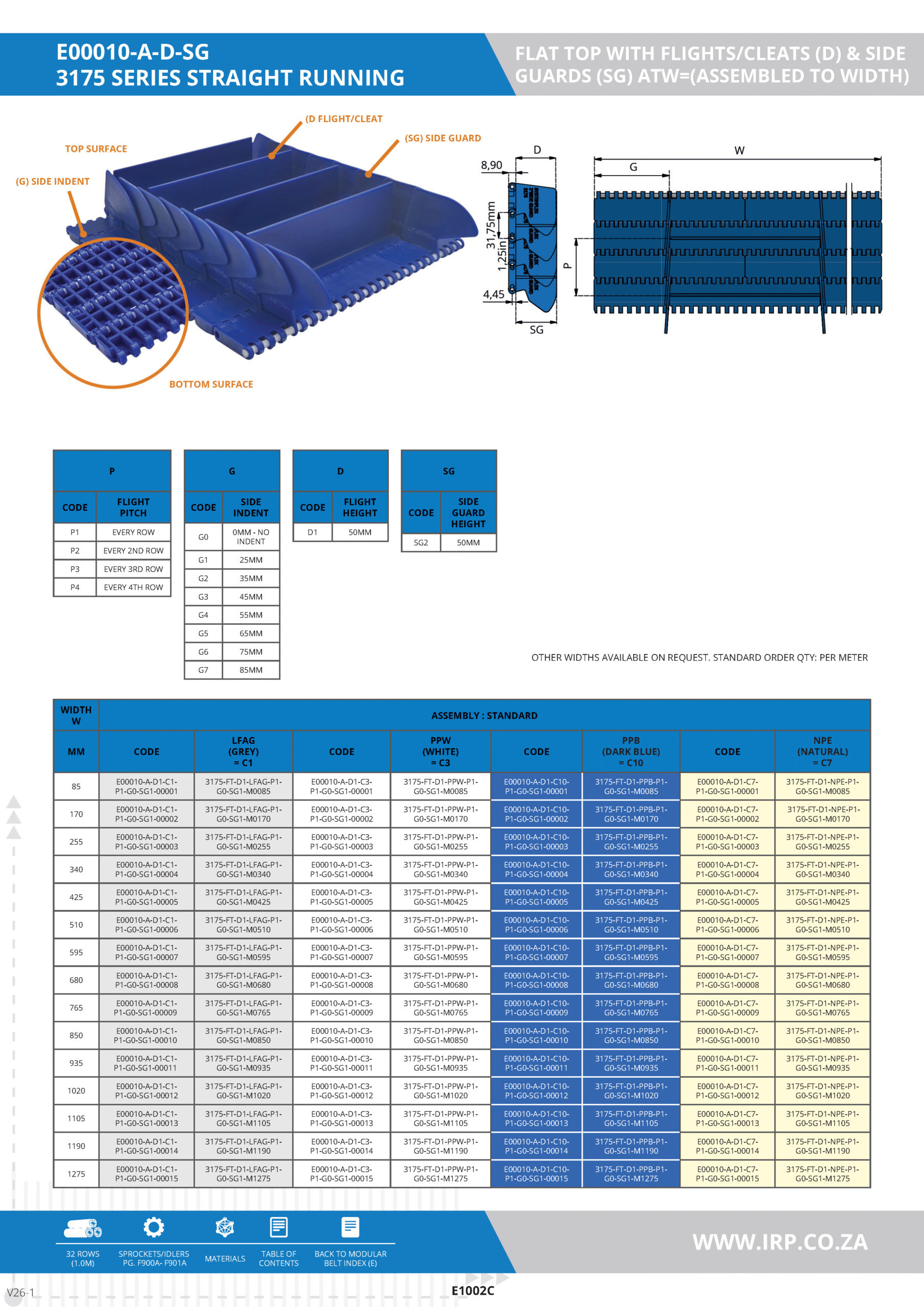 This 3175 Series is a straight-running modular belt featuring a flat top surface with integrated vertical Flights/Cleats (D) and Side Guards (SG). This design prevents rollback, retains product spacing, and minimizes spillage—making it ideal for incline or decline conveying. With configurable flight pitch, cleat height, and side indent sizes, this belt is suitable for a range of industrial and hygienic applications. Made from polypropylene (PPW/PPB) or polyethylene (NPE), it provides excellent chemical resistance or cold performance depending on the chosen material.