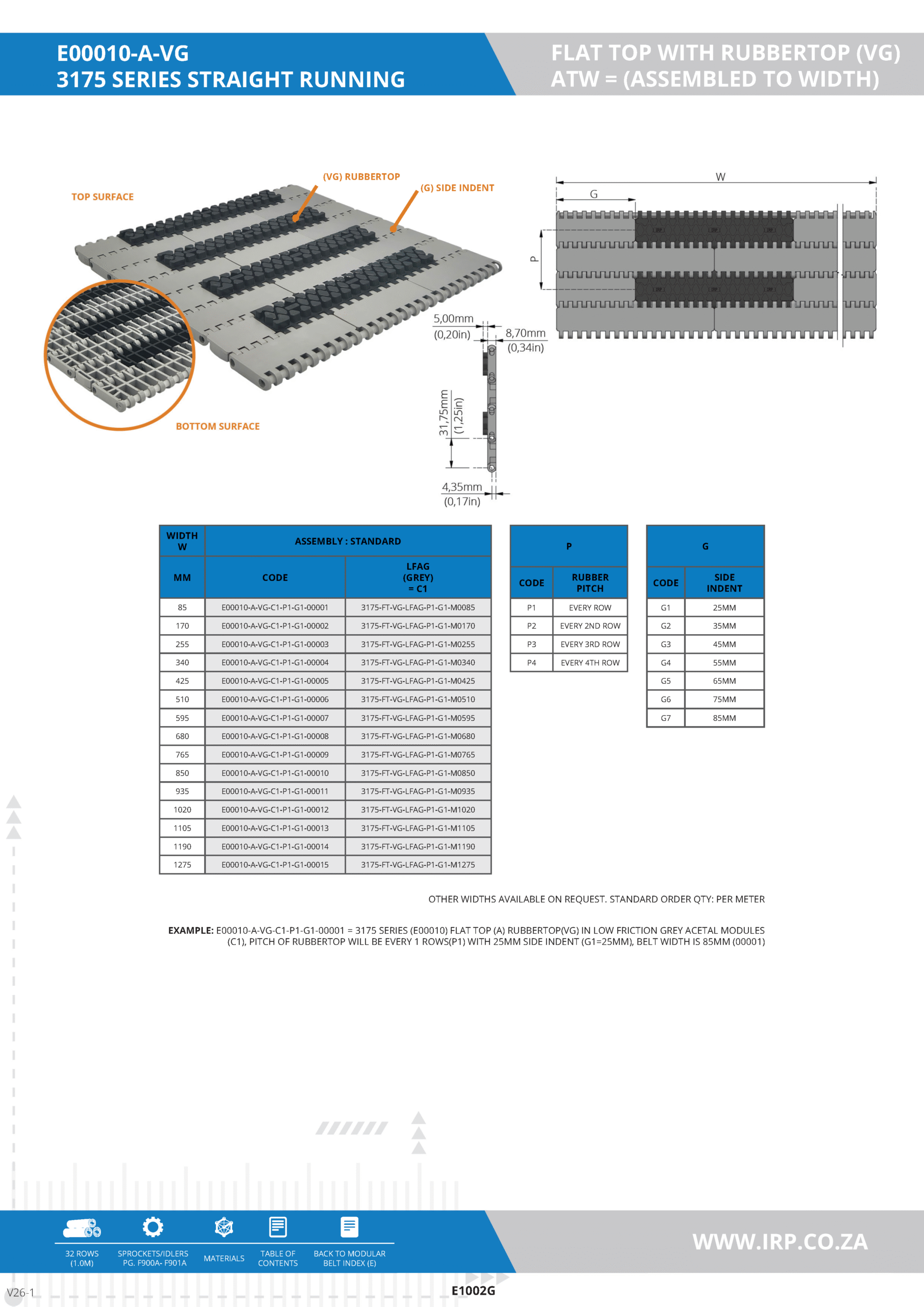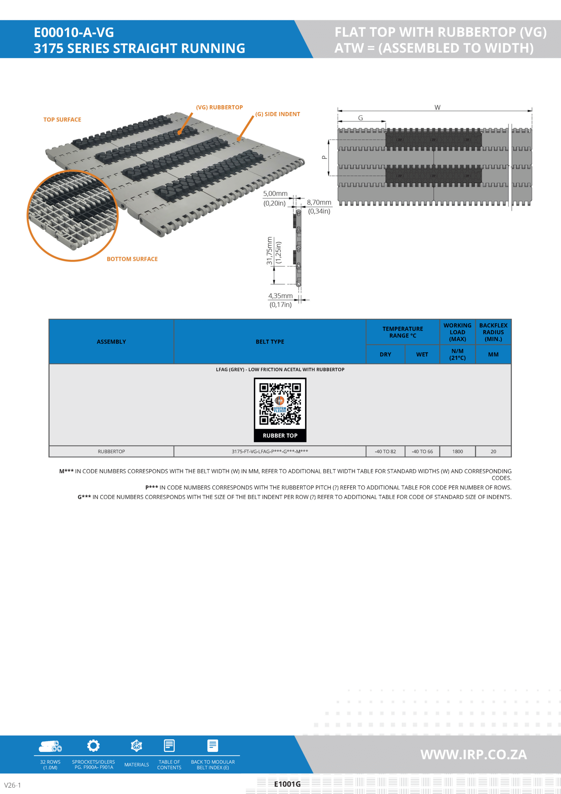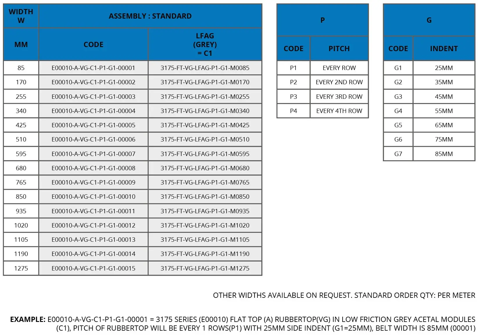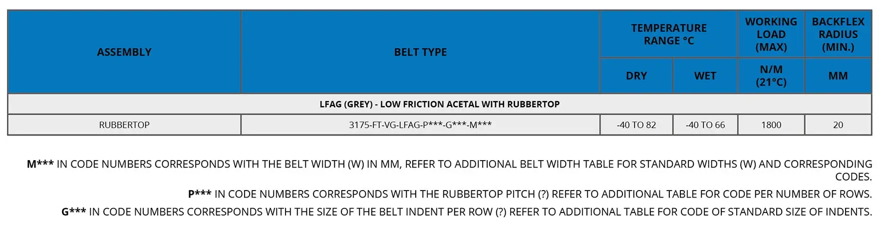 LFAG (Grey): Provides low friction, reducing energy consumption and wear while maintaining excellent performance in various industrial settings. The integrated RubberTop surface enhances grip, making it ideal for applications requiring additional product control.
