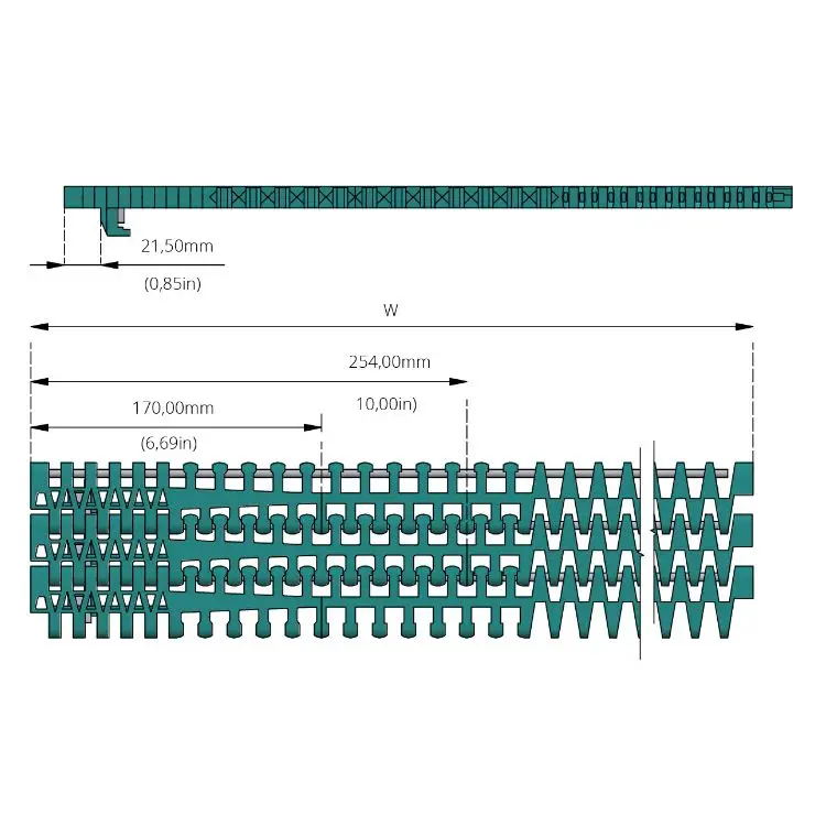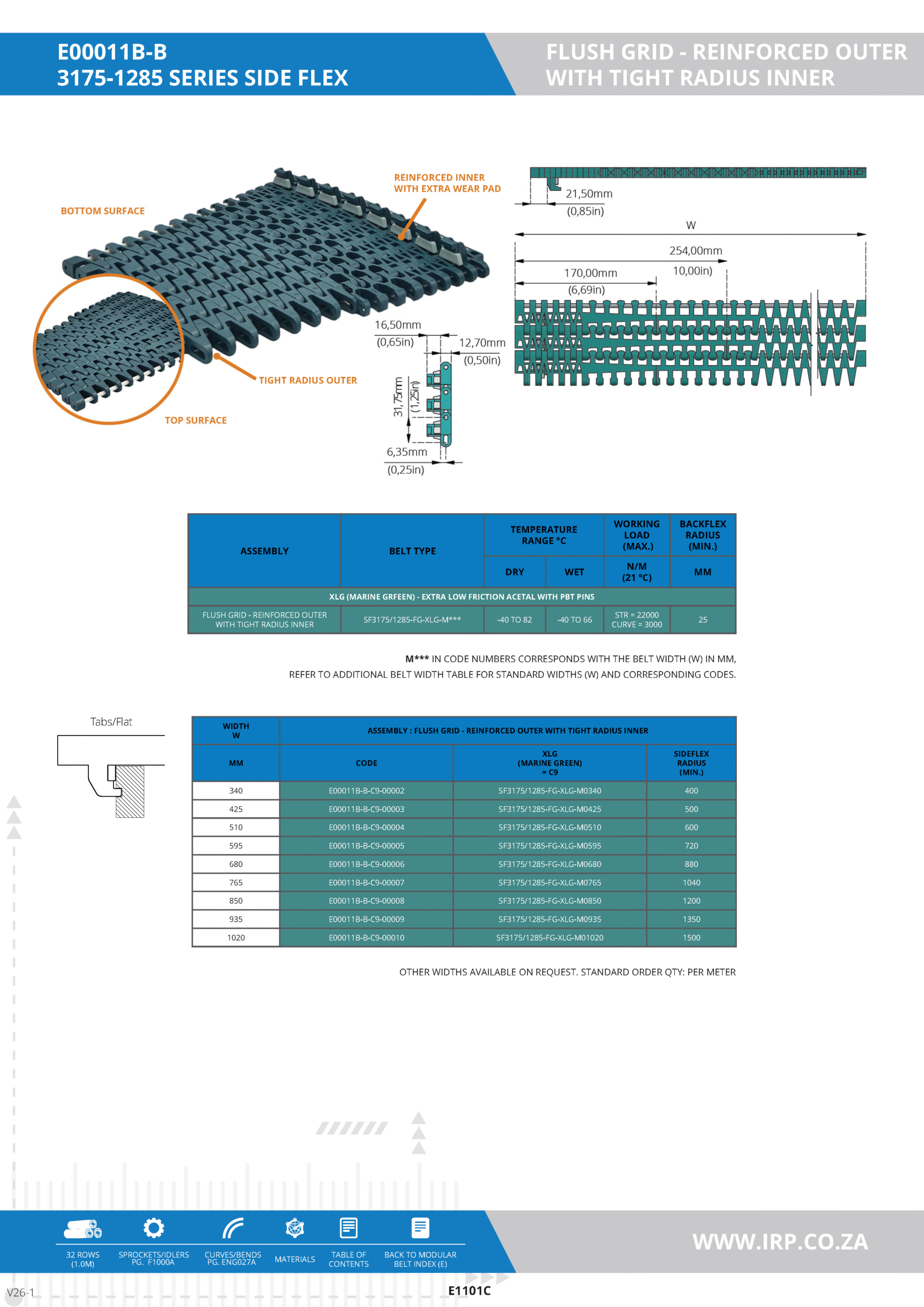 Extra Low Friction Acetal provides excellent wear resistance and low friction properties, ensuring smooth, reliable operation. The PBT pins add strength and durability, making this material ideal for high-performance conveyor applications where tight radius flexing is required.