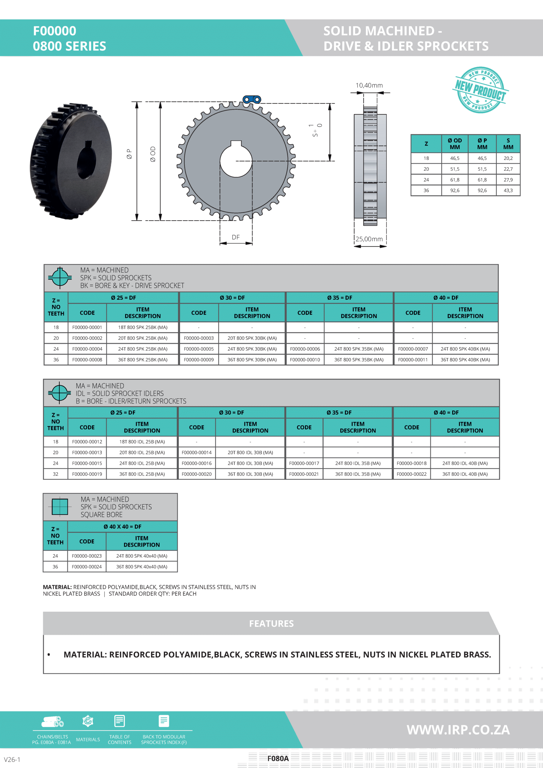 Made from reinforced polyamide, these sprockets provide excellent wear resistance and durability in industrial applications. The use of stainless steel screws and nickel-plated brass nuts ensures corrosion resistance, making them suitable for harsh environments.