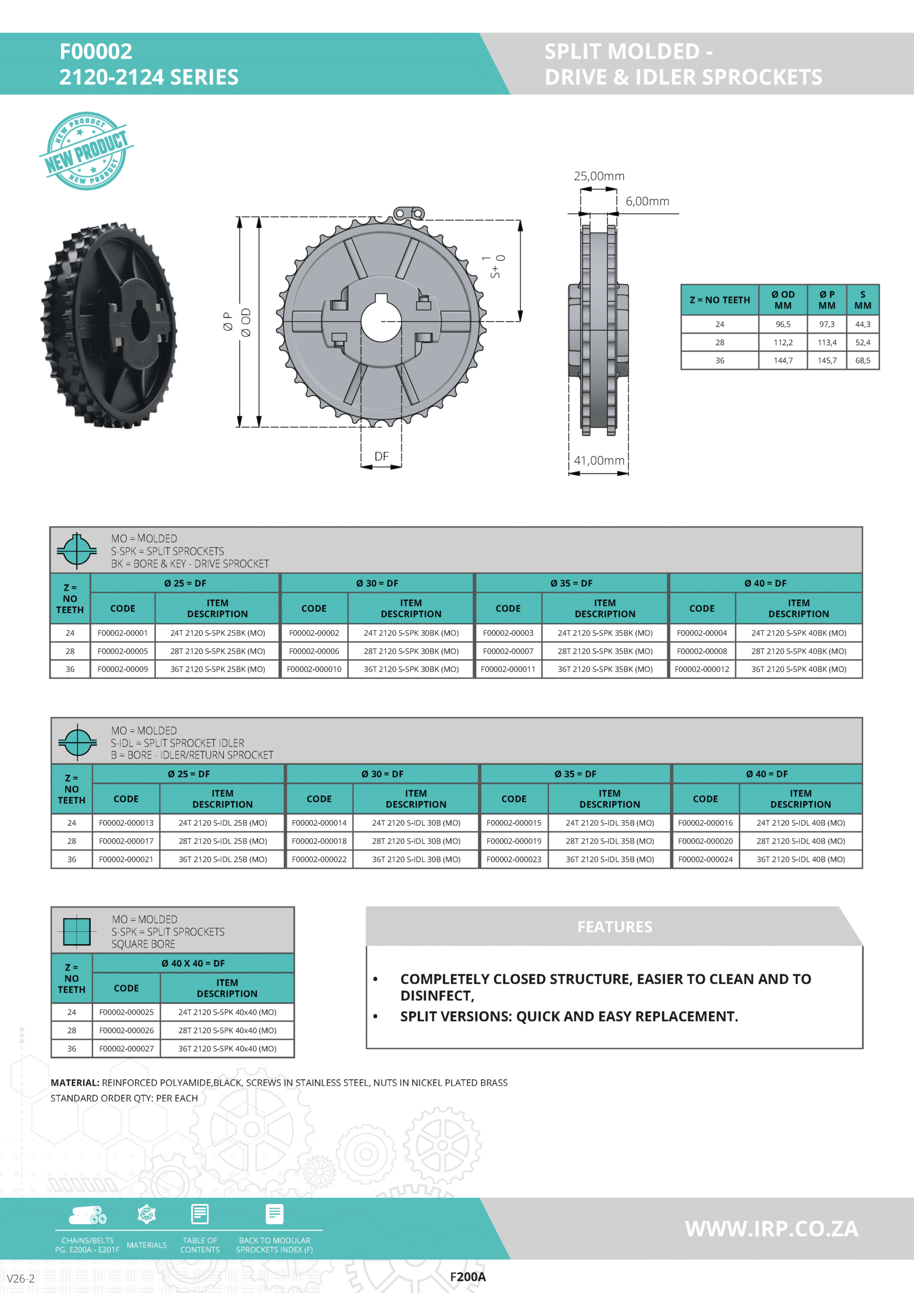 The 2120-2124 Series Split Molded Drive & Idler Sprockets are engineered to improve the efficiency and flexibility of conveyor systems. The sprockets come in multiple configurations, with options for 24, 28, and 36 teeth to suit specific operational requirements. The split molded design allows for quick and easy replacement without the need to disassemble the shaft, minimizing downtime. These sprockets are ideal for conveyor systems where hygiene and easy maintenance are critical, such as in food processing or packaging industries.