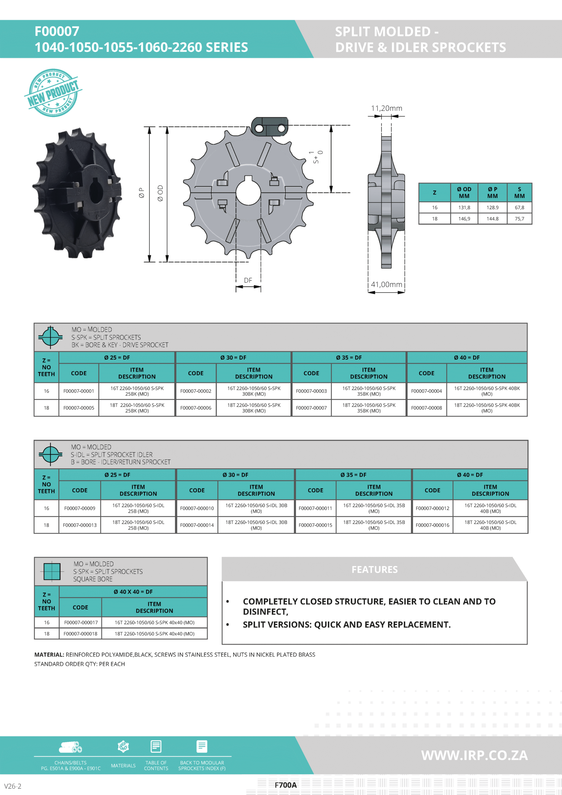 Made from reinforced polyamide, these sprockets offer superior strength and resistance to wear. The material is also corrosion-resistant, making it ideal for harsh or hygienic environments. Screws are constructed from stainless steel, while nuts are made from nickel-plated brass, enhancing the durability of the assembly.