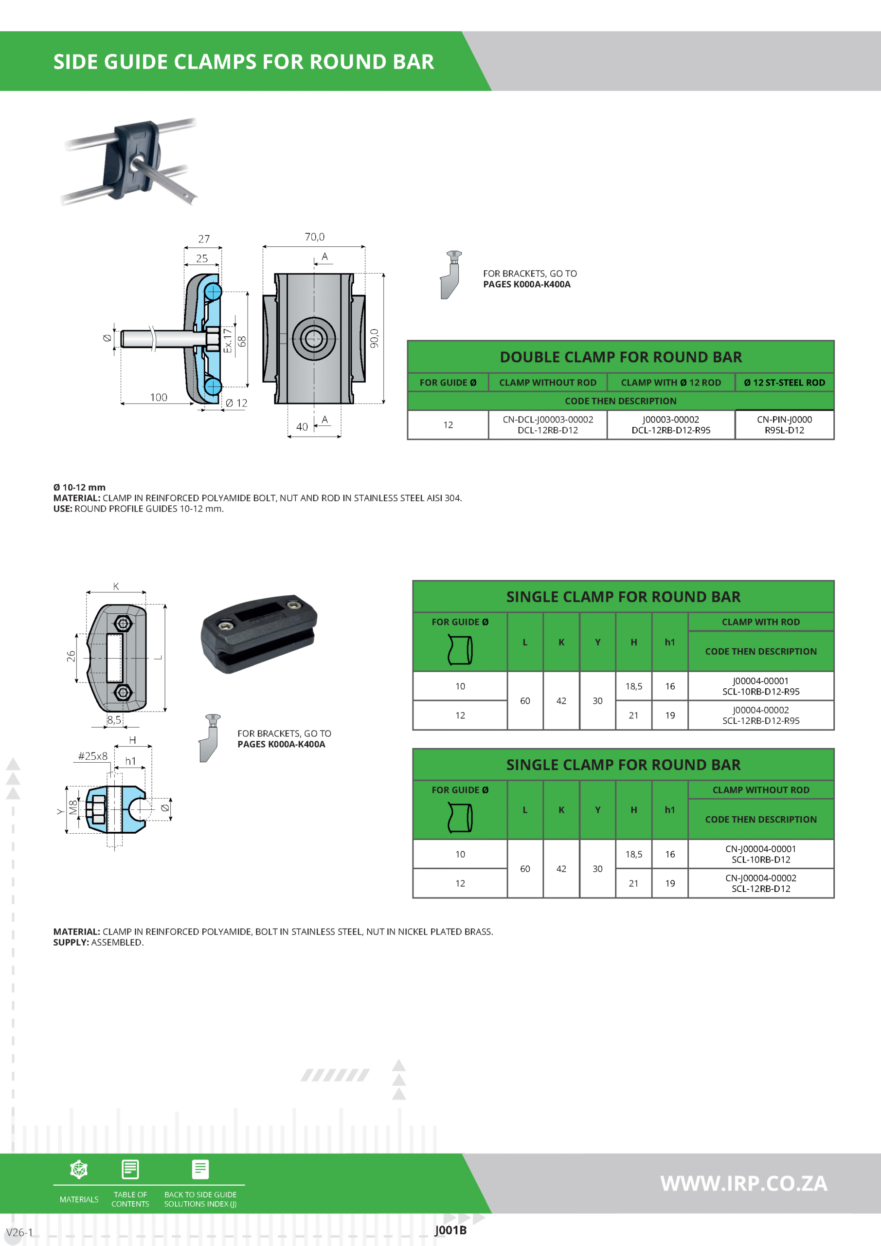 The Side Guide Clamps for Round Bars are specifically designed to hold and Stainless Steel Round Bar profiles within a conveyor system. These clamps are available in configurations with or without rods and are made from reinforced polyamide, ensuring strength and durability. These clamps are ideal for use in various industrial applications where precise guidance and stability of the conveyor belt are required.