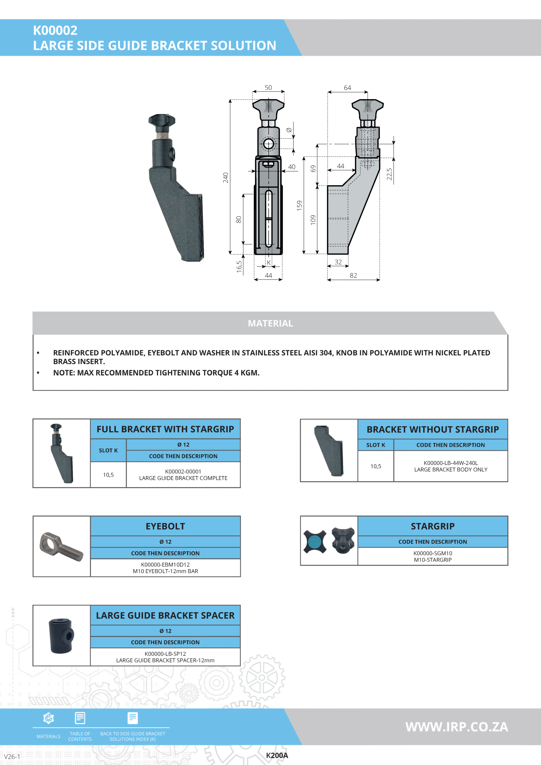 Made from high-strength reinforced polyamide combined with corrosion-resistant stainless steel and durable nickel-plated brass, this guide bracket is designed for both strength and longevity, making it suitable for a variety of industrial environments.