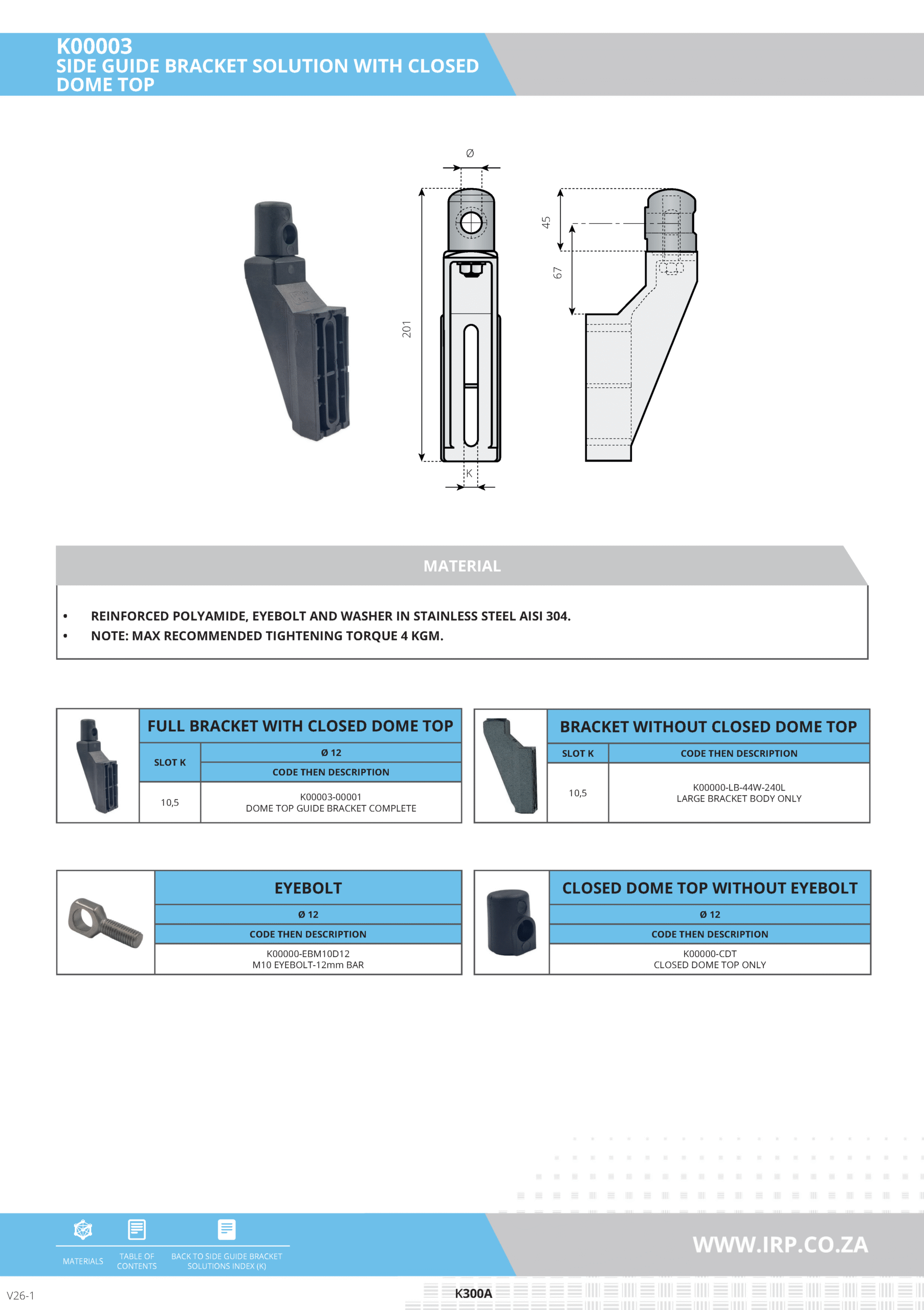 Constructed from high-strength reinforced polyamide and complemented with stainless steel components, this guide bracket is robust and resistant to corrosion, ensuring operational reliability and extended lifespan.