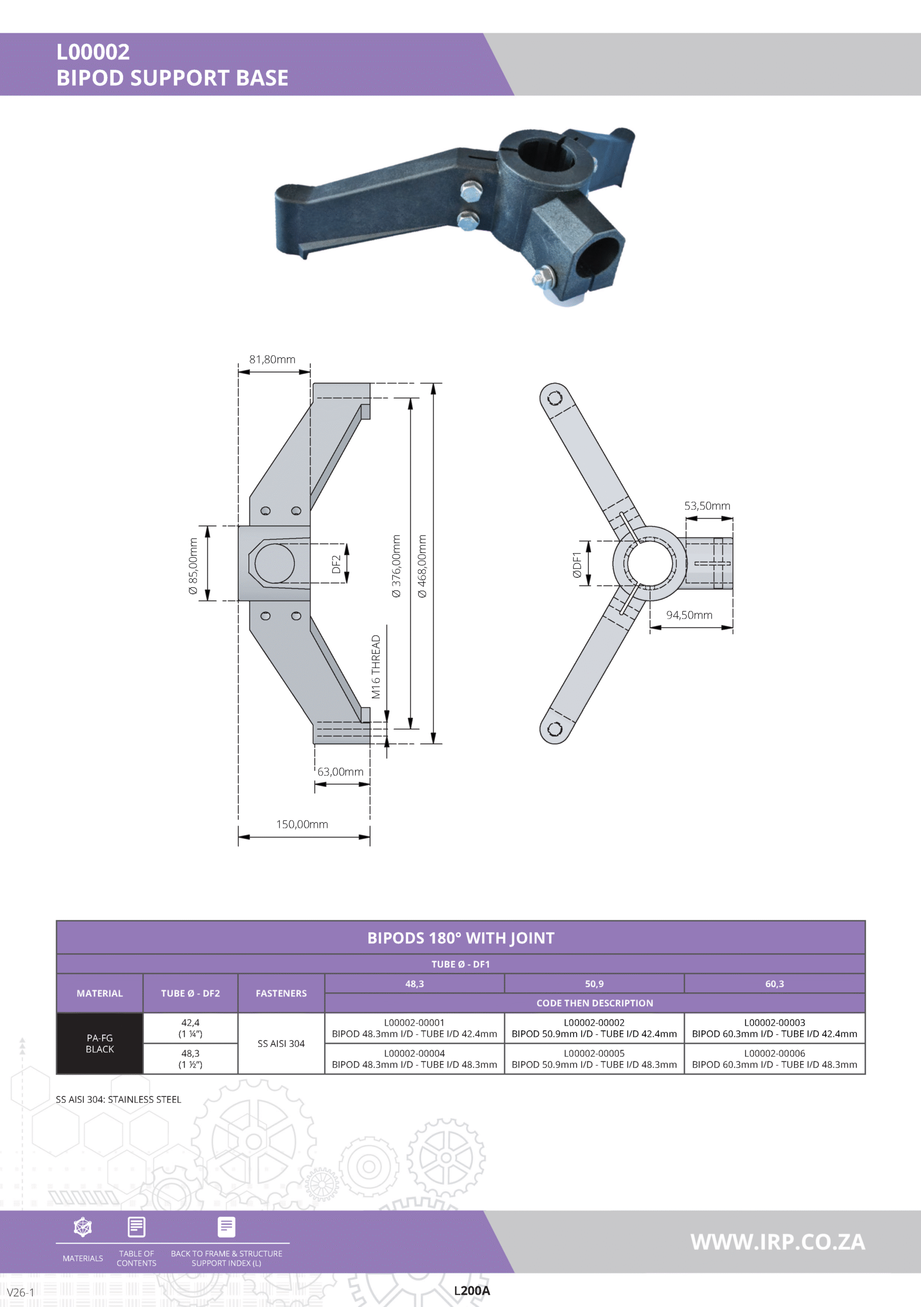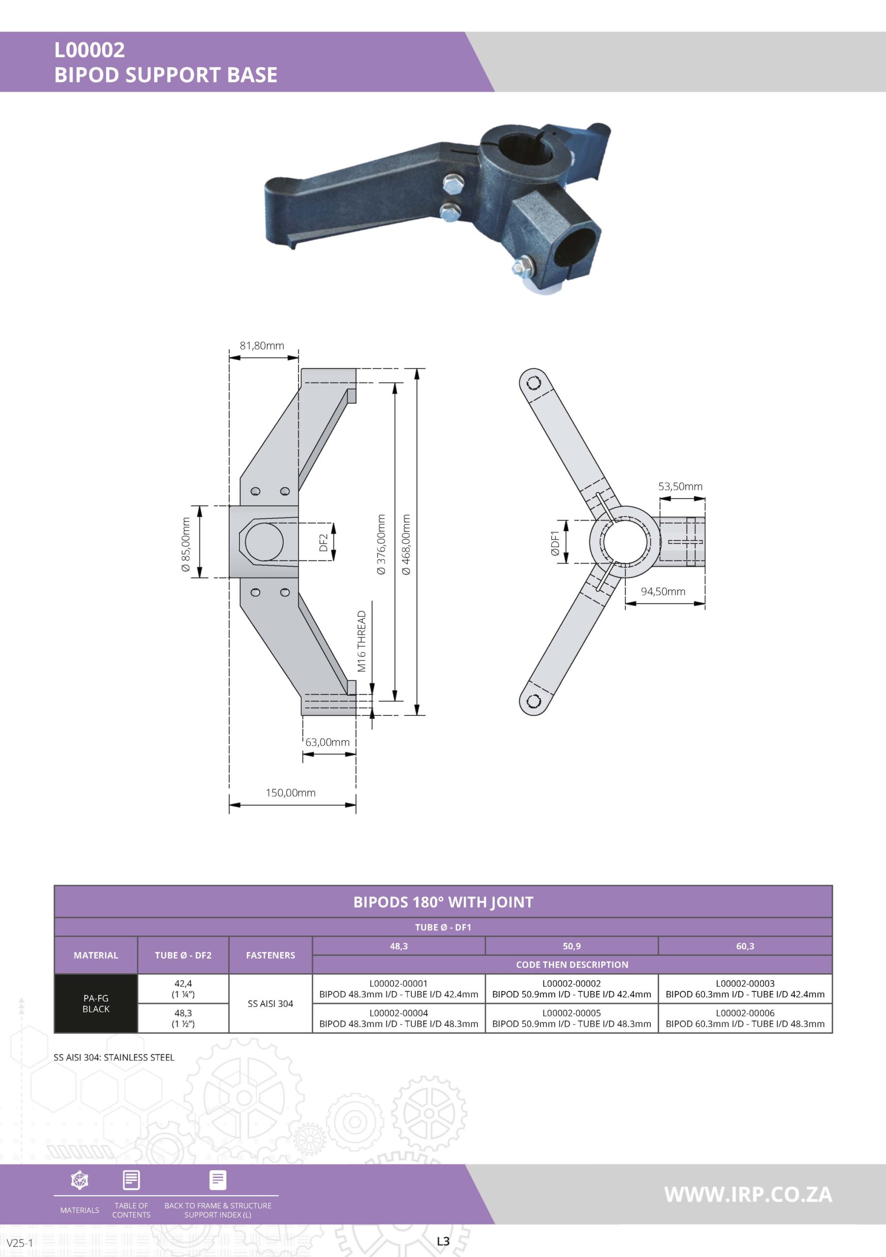 The Bipod Support Base is a robust support component designed to provide stable and adjustable support for industrial structures. It features a 180° joint, allowing for versatile positioning and secure mounting in various industrial settings. The base is constructed from high-quality polyamide fiber glass composite (PA-FG) and is equipped with stainless steel fasteners (SS AISI 304) for enhanced durability and corrosion resistance. Available in multiple configurations to accommodate different tube diameters, this bipod support base is ideal for applications requiring flexible and reliable support.