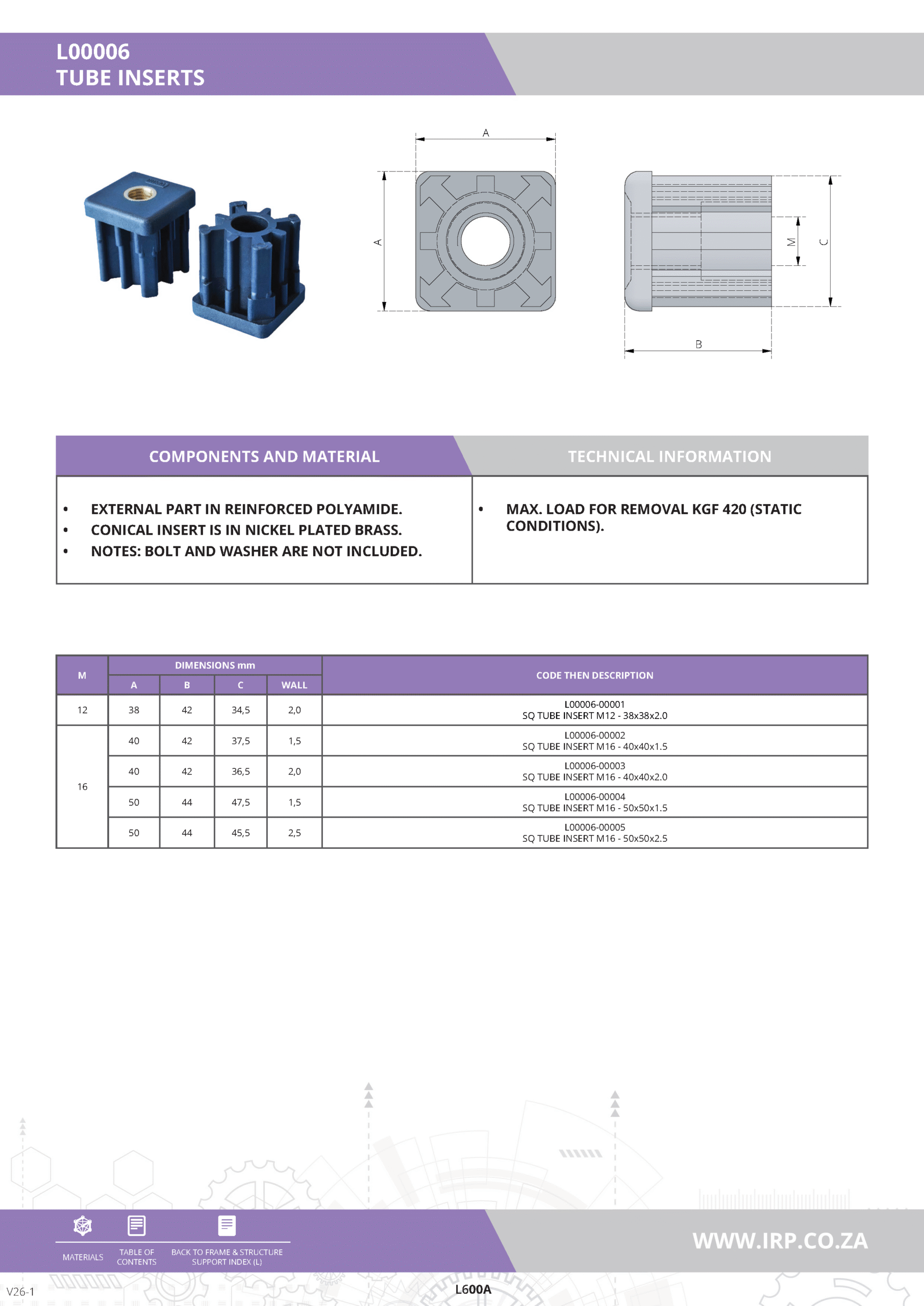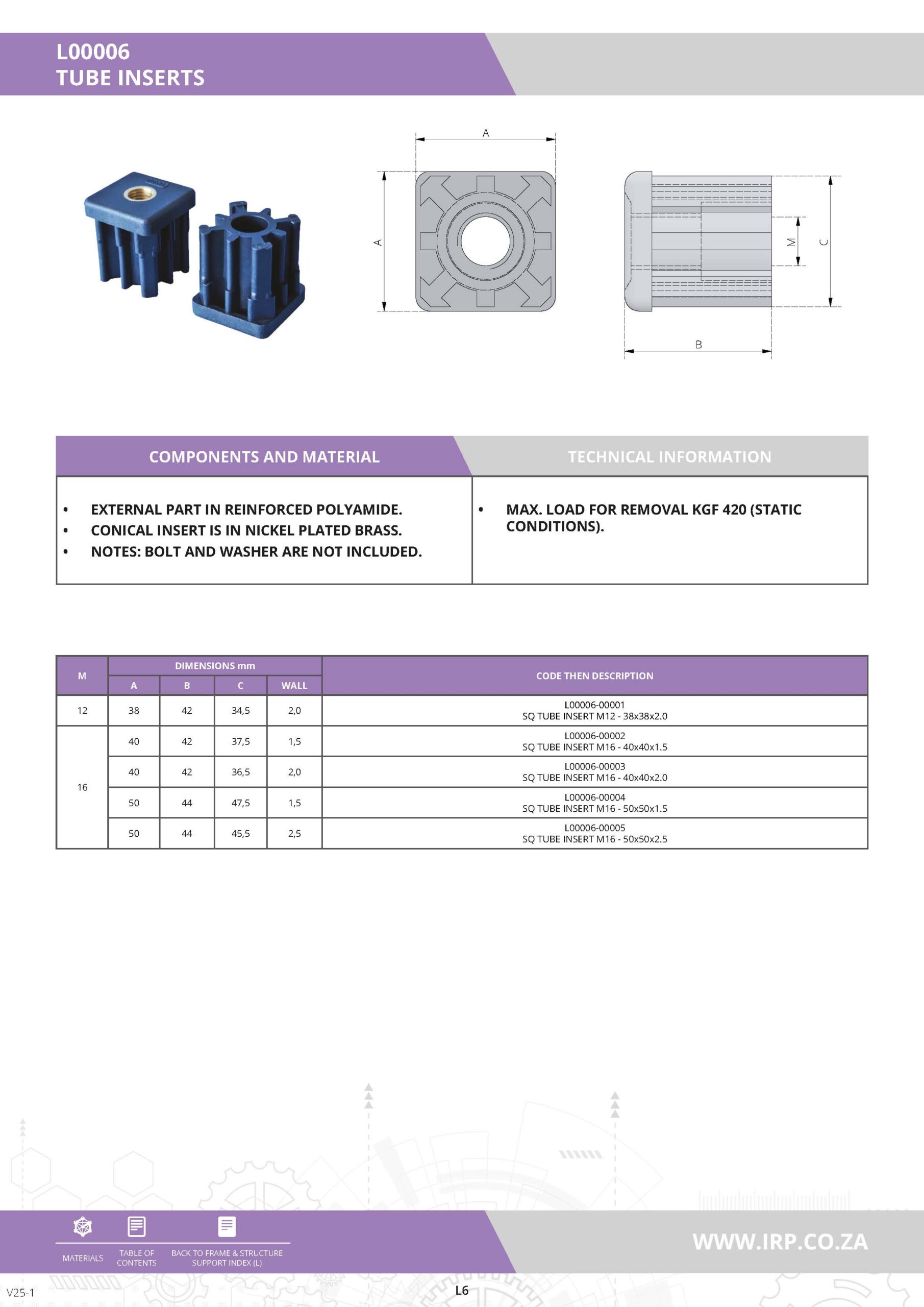 The L00006 Tube Inserts are engineered for secure fastening and reinforcement of square tubing in conveyor frames and structural assemblies. Featuring an external body made of reinforced polyamide and a nickel-plated brass conical insert, these tube inserts provide excellent strength, wear resistance, and corrosion protection. They are available in both M12 and M16 sizes, with various tube dimensions to suit different load requirements. With a maximum static removal load of 420 KGF, they ensure reliable and long-lasting performance in demanding industrial conditions.